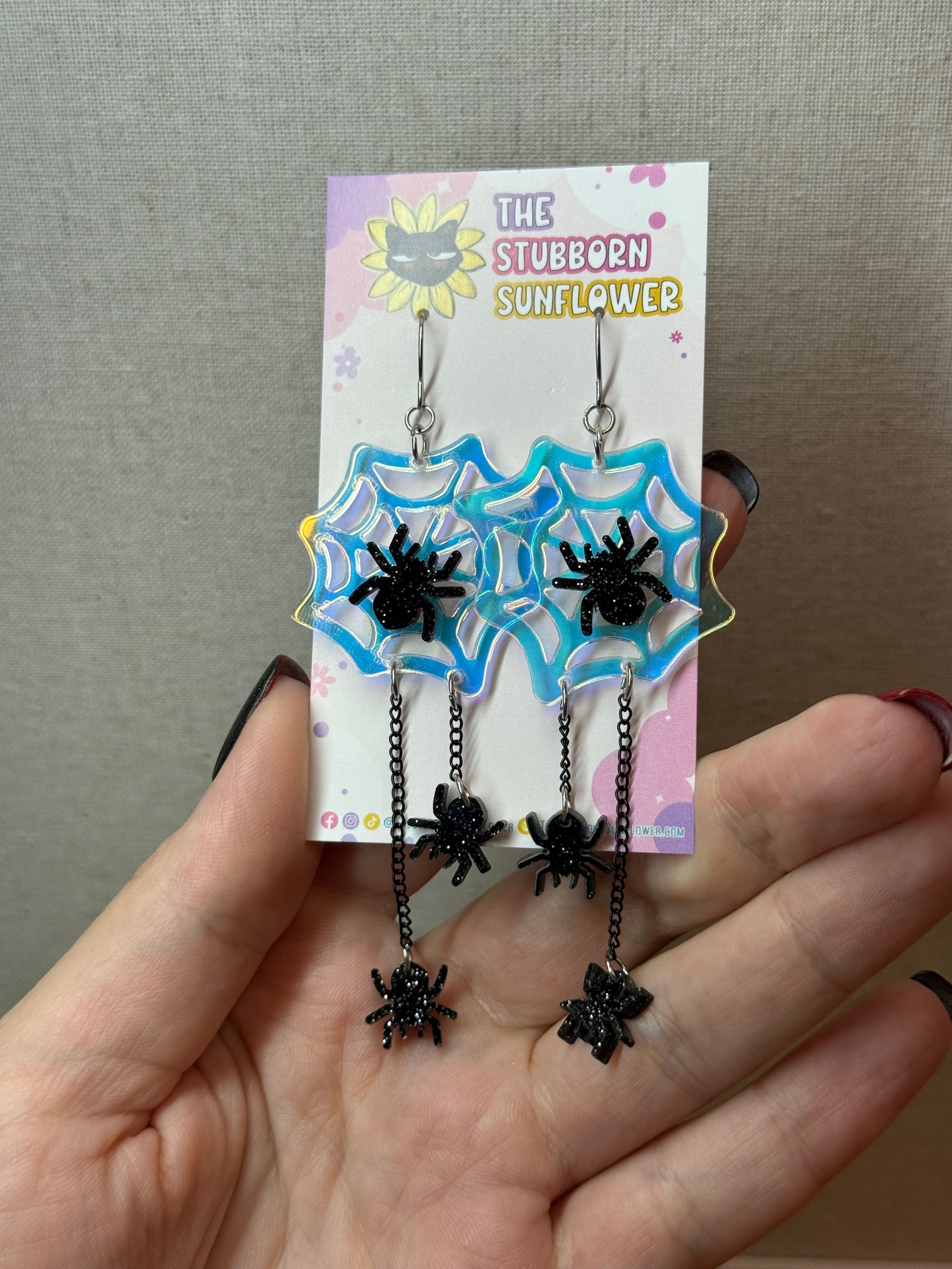 Add a touch of spookiness to your look with our Spider Web Dangle Earrings. The holographic spider web design and dangling spiders are sure to catch eyes (and maybe a few arachnophobes). Perfect for Halloween (or any time you want to spin a web of style).