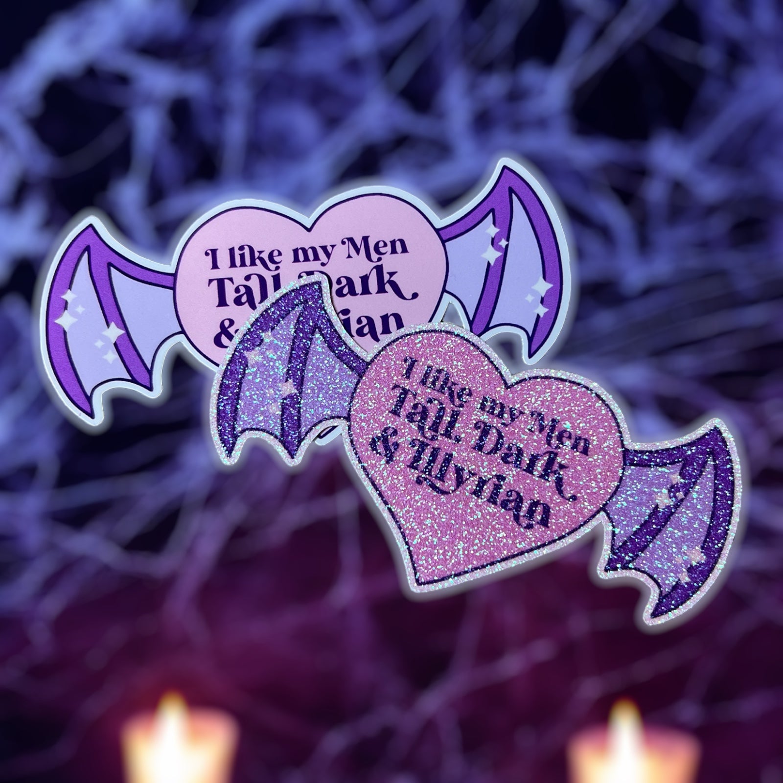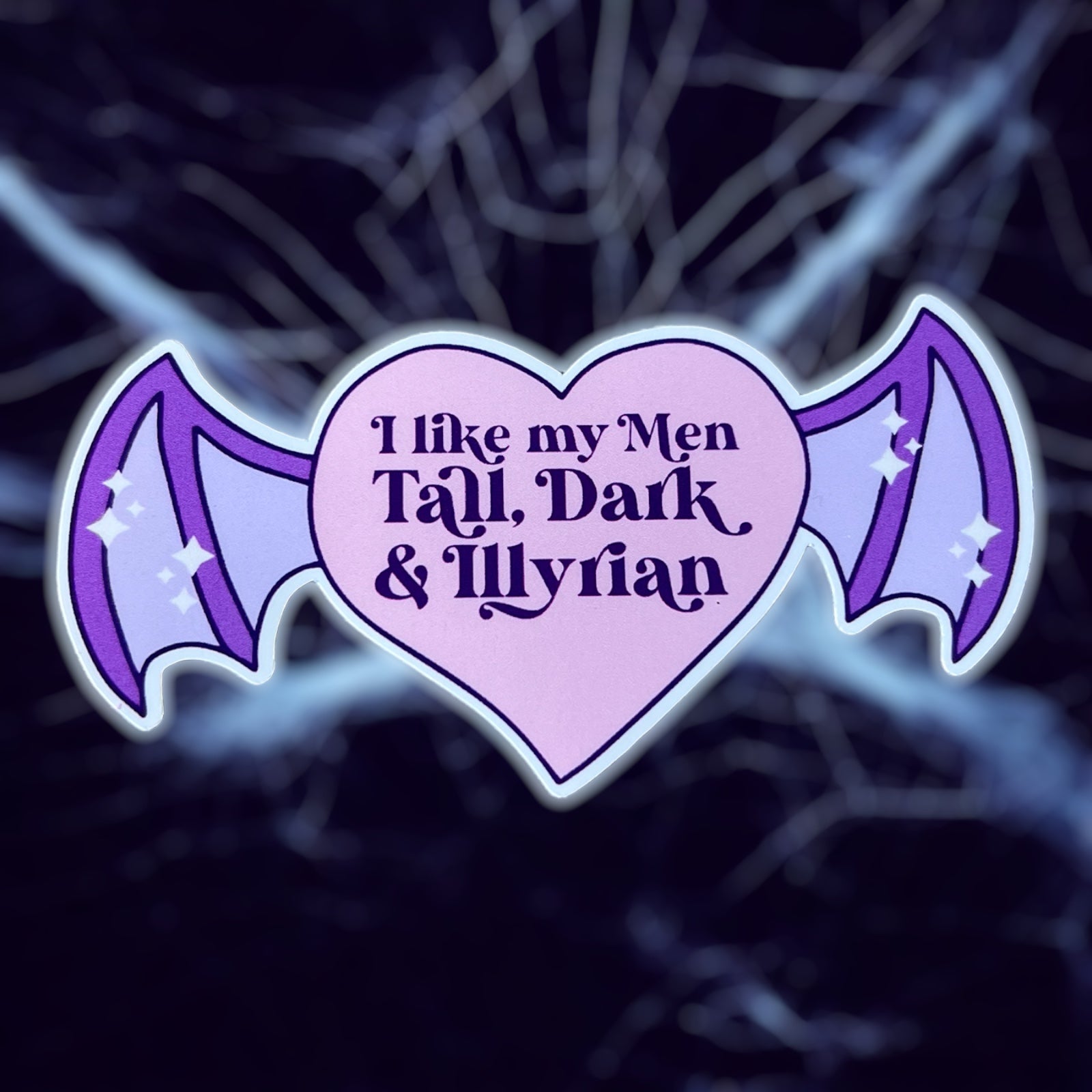 Add some sass to your belongings with our Tall, Dark, & Illyrian sticker. Perfect for showing off your love for tall and dark men (or women!), with the optional glitter or glossy finish adding a touch of sparkle.