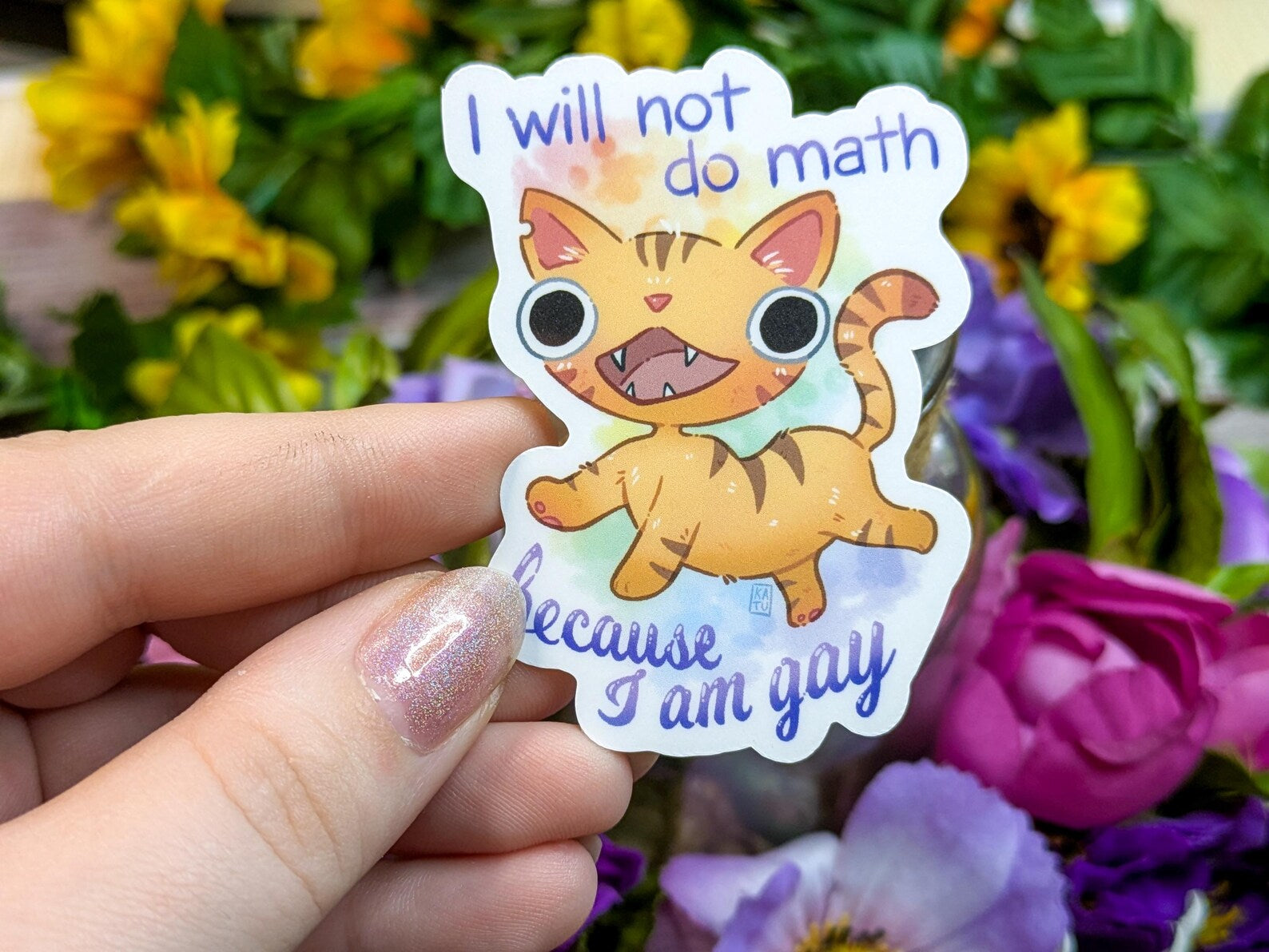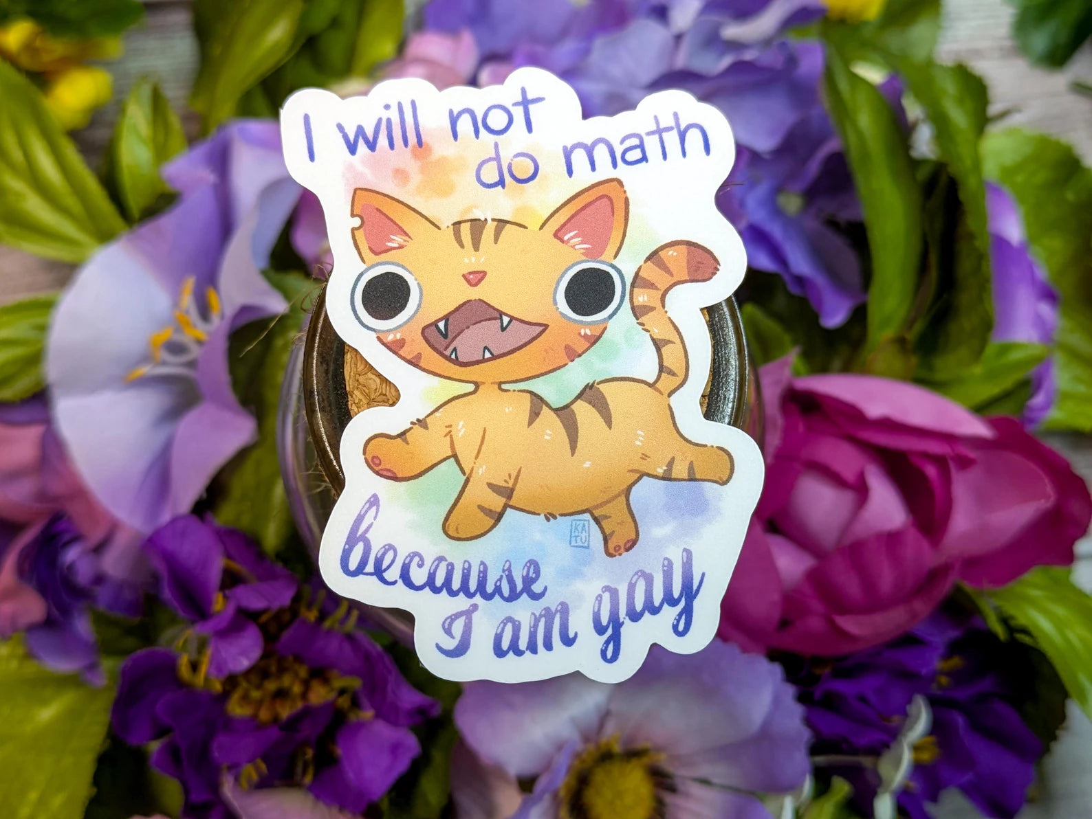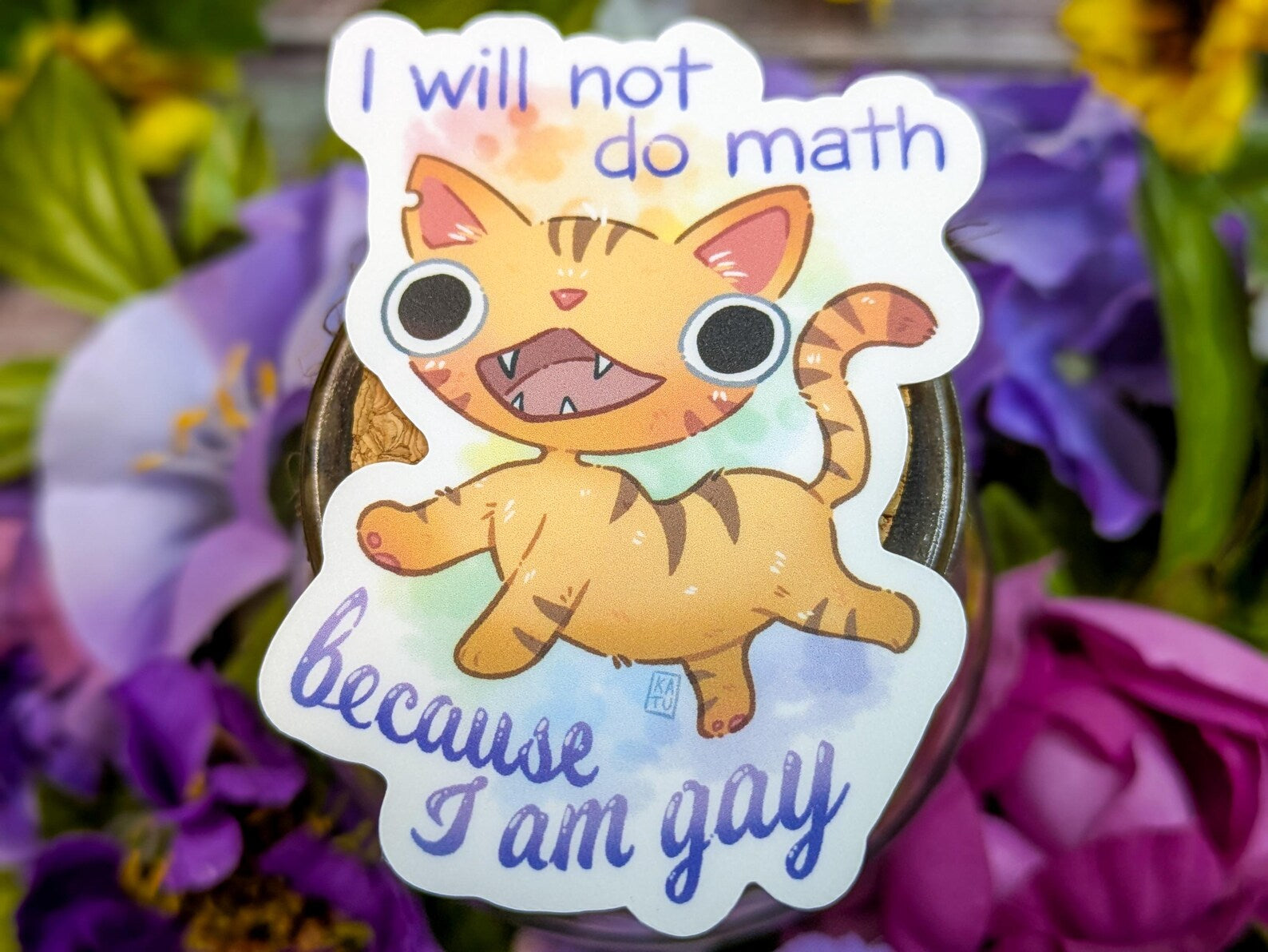 A friend (shoutout to @herecomesnayart) once said these most wise of words: "and i will not do math because i am gay" - which I immediately knew I needed to put on my laptop. Making it available for sale is really just a side effect of me needing this sticker for myself.