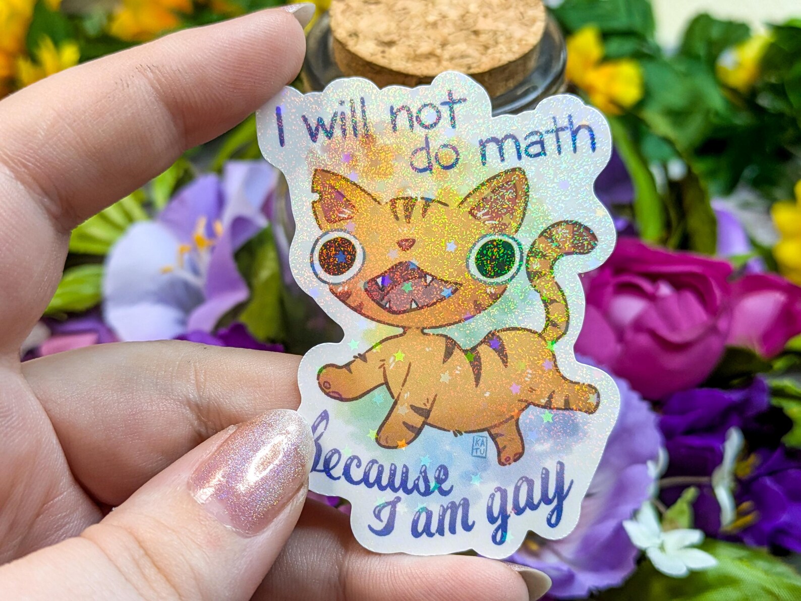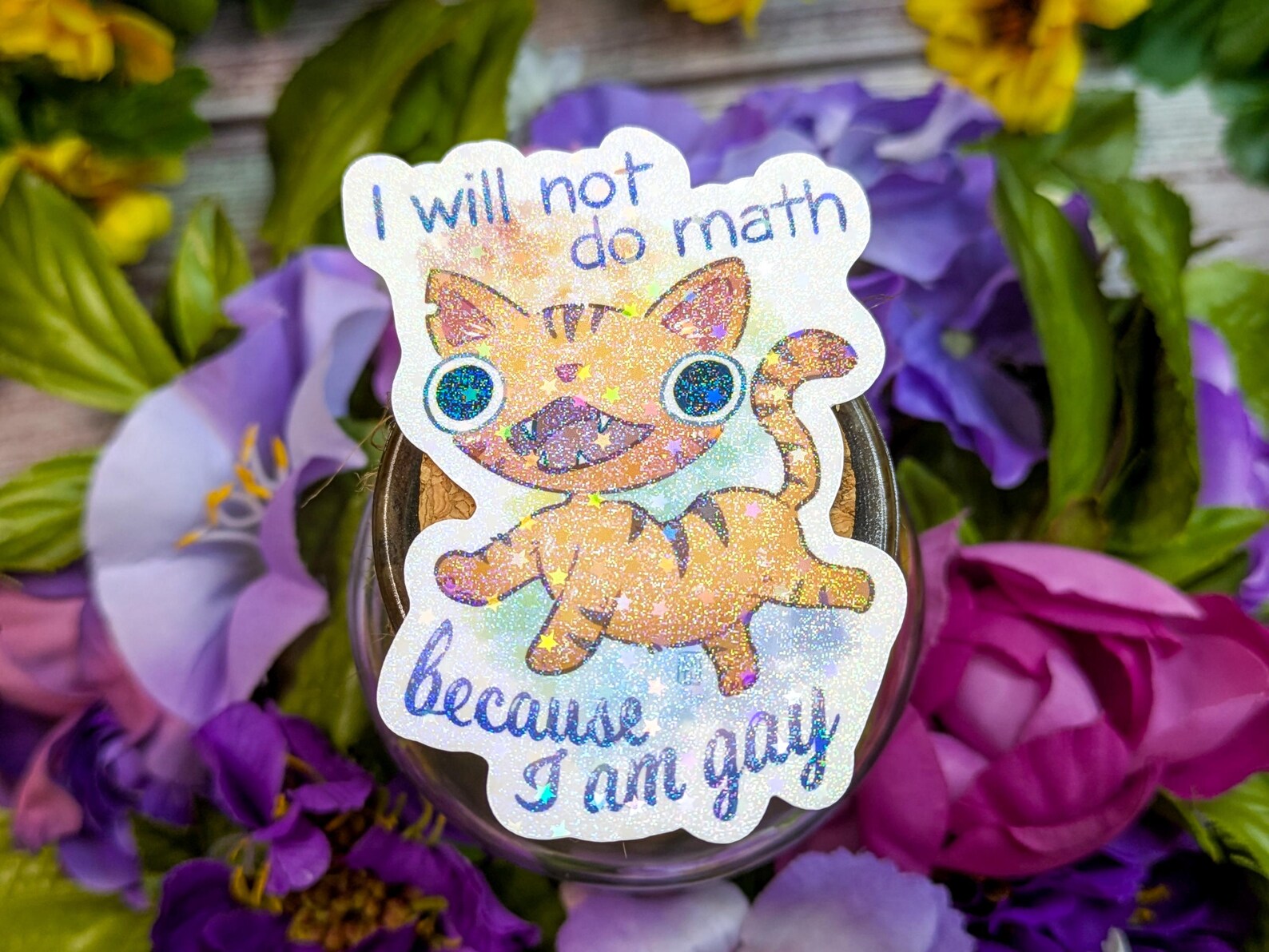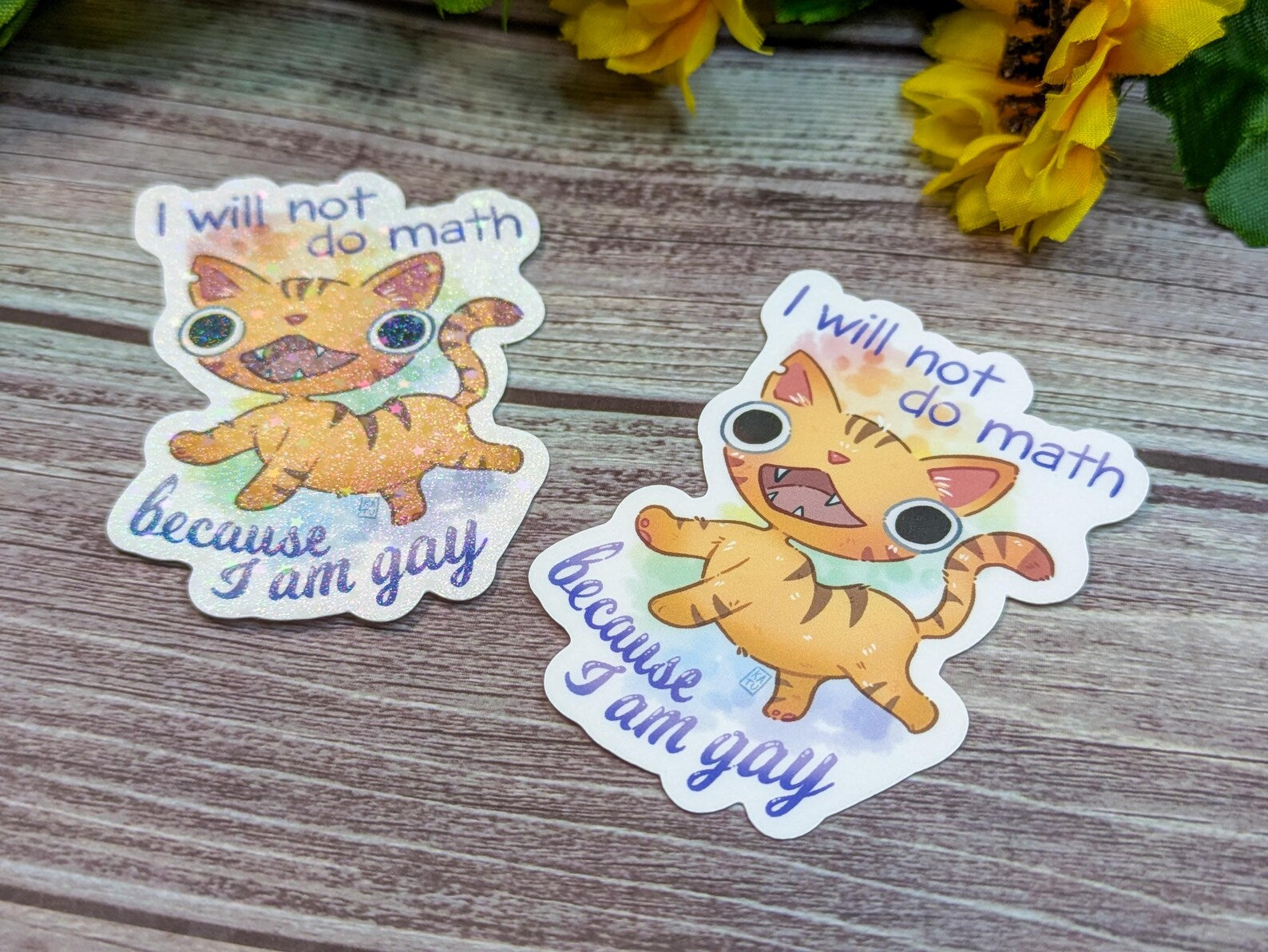 A friend (shoutout to @herecomesnayart) once said these most wise of words: "and i will not do math because i am gay" - which I immediately knew I needed to put on my laptop. Making it available for sale is really just a side effect of me needing this sticker for myself.